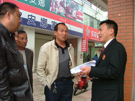 中国法院网开封频道讯 为了有利引导社区群众学法、知法、信法、尚法、守法。开封市金明区法院开展了“法官六进社区”:开庭在社区、调解在社区、执行在社区、普法在社区、综合治理在社区、矫正在社区。将法院的审判、执行工作与社区居民的和谐稳定和司法需求有机结合,建立起全方位、立体式的社区司法服务和保障网络。图为该院法官在社区为群众解答疑难法律问题。