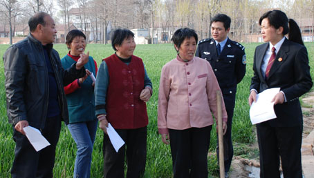 中国法院网开封频道讯 “五四”青年节前夕,河南省兰考县人民法院的青年法官走进田间地头,来到农民身边,了解民情民意,服务农民群众生产生活,尽力帮助群众解决实际问题。图为5月2日该院青年法官利用节假日来到群众中间为群众提供法律咨询服务。