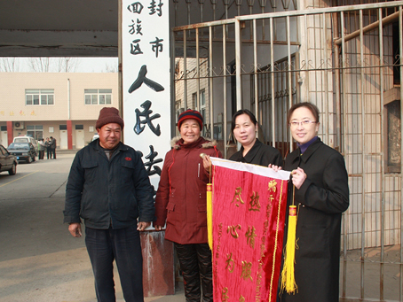 中国法院网开封频道讯 1月19日上午,家住开封市东郊乡的阮桂芹老人的儿子和女儿一同来到开封市顺河区法院,将一面绣有“尽心为民、热情服务”的锦旗送至该院民二庭庭长吴红艳的手中,感谢吴法官成功调解一起交通肇事赔偿案,使其年逾75岁的母亲阮桂芹获得了赔偿。